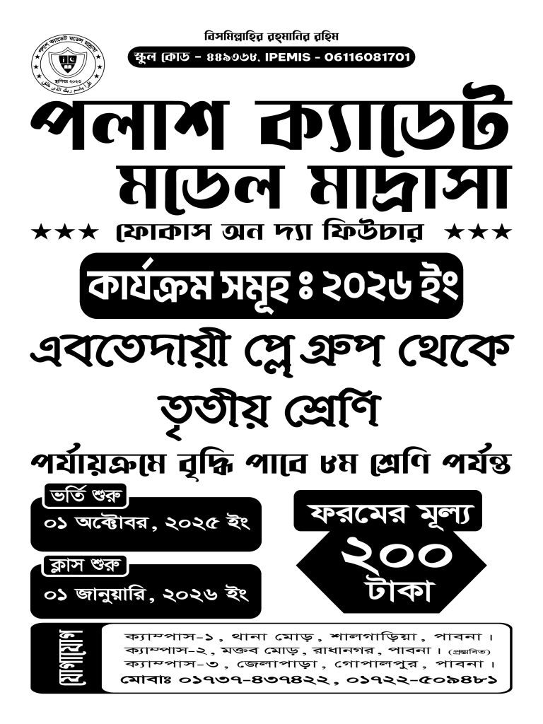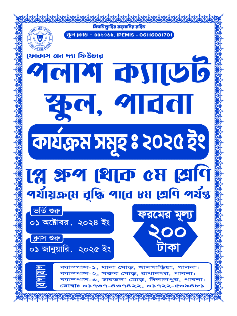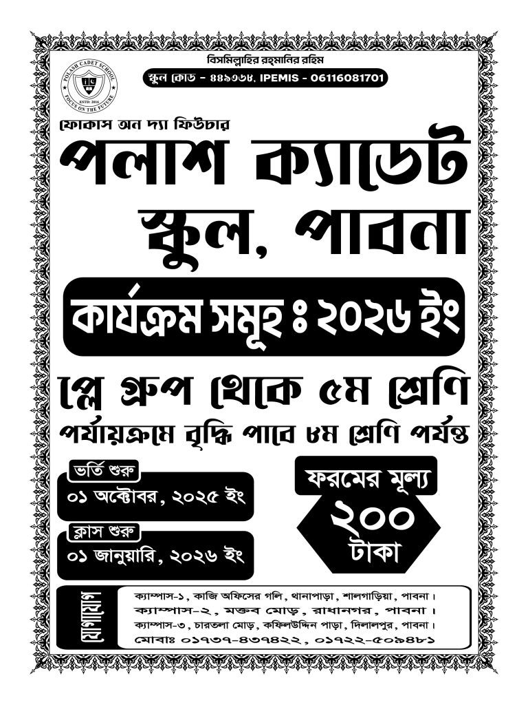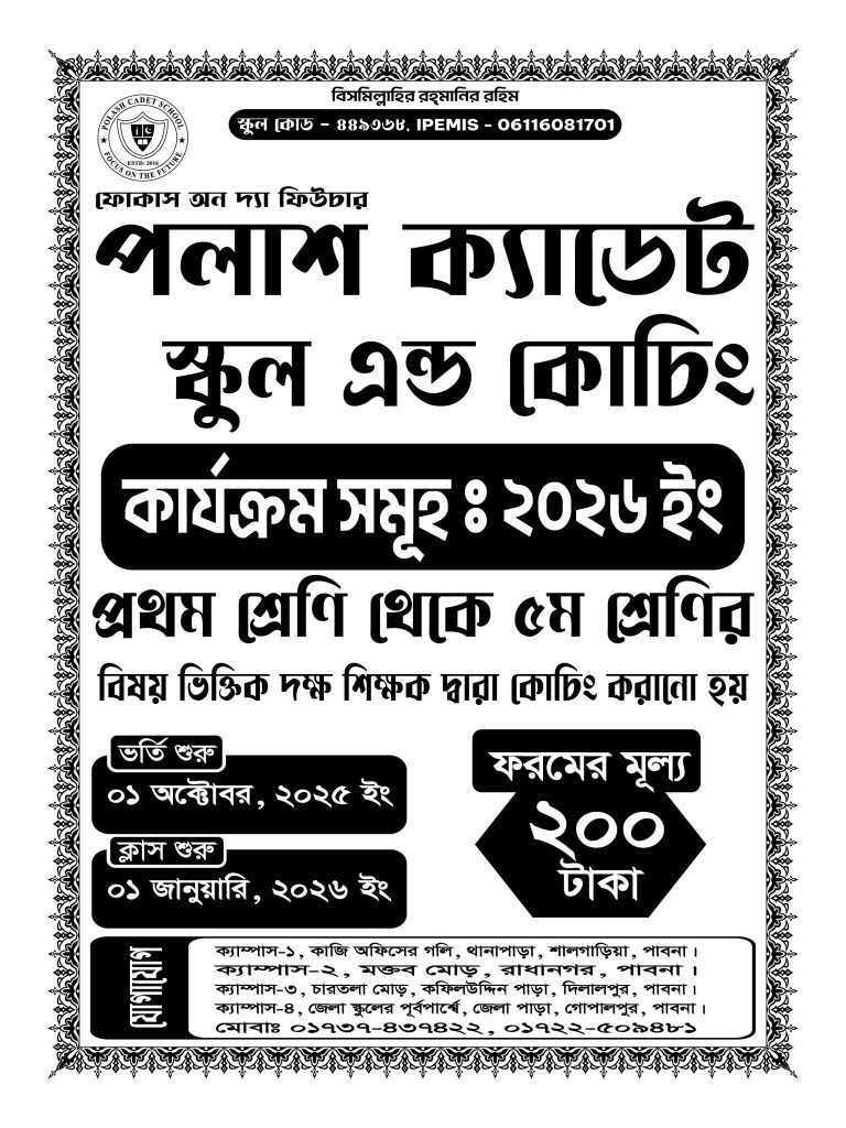 পলাশ ক্যাডেট স্কুল, পাবনার একটি আধুনিক ও মানসম্মত শিক্ষাপ্রতিষ্ঠান, যেখানে শিক্ষার্থীরা শৃঙ্খলা, নৈতিকতা ও সৃজনশীলতার বিকাশে আধুনিক সুযোগ-সুবিধা এবং দক্ষ শিক্ষকদের তত্ত্বাবধানে শিক্ষাগ্রহণ করে। সীমিত আসনের ভিত্তিতে ভর্তি প্রক্রিয়া চলছে। আপনার সন্তানের উজ্জ্বল ভবিষ্যৎ নিশ্চিত করতে আজই ভর্তি নিশ্চিত করুন!